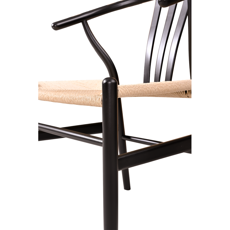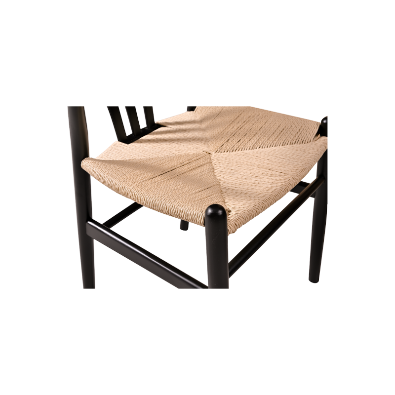 La seduta di questa sedia è realizzata in corda intrecciata con un motivo geometrico, che conferisce al mobile un carattere unico e una sensazione di leggerezza. Oltre a un aspetto estetico raffinato, offre anche resistenza e comfort d’uso. La tonalità naturale della corda crea un piacevole contrasto con la struttura scura della sedia, dando vita a una composizione armoniosa che unisce artigianalità tradizionale e design moderno.