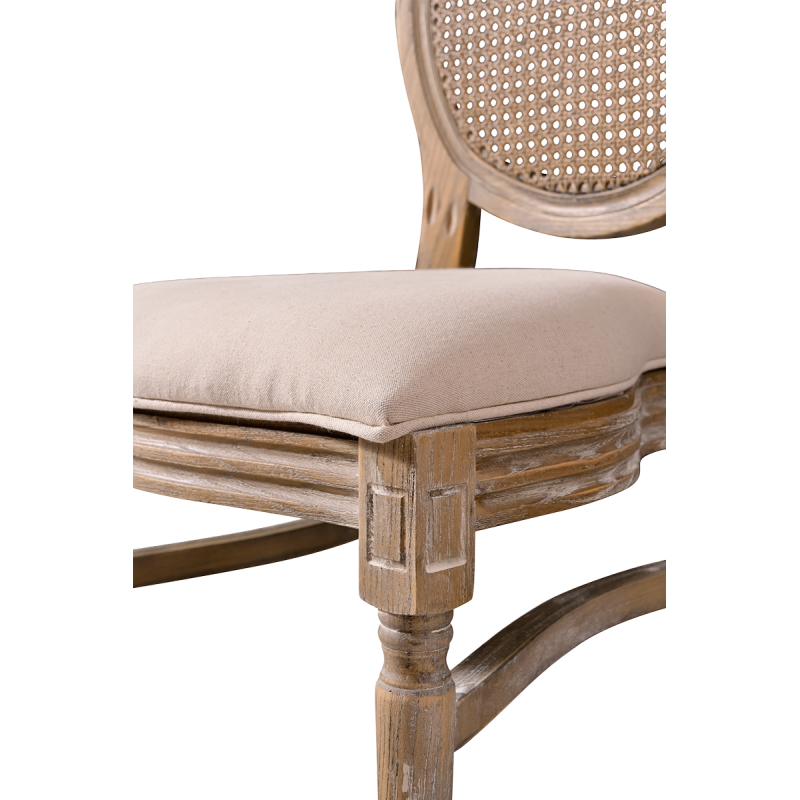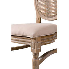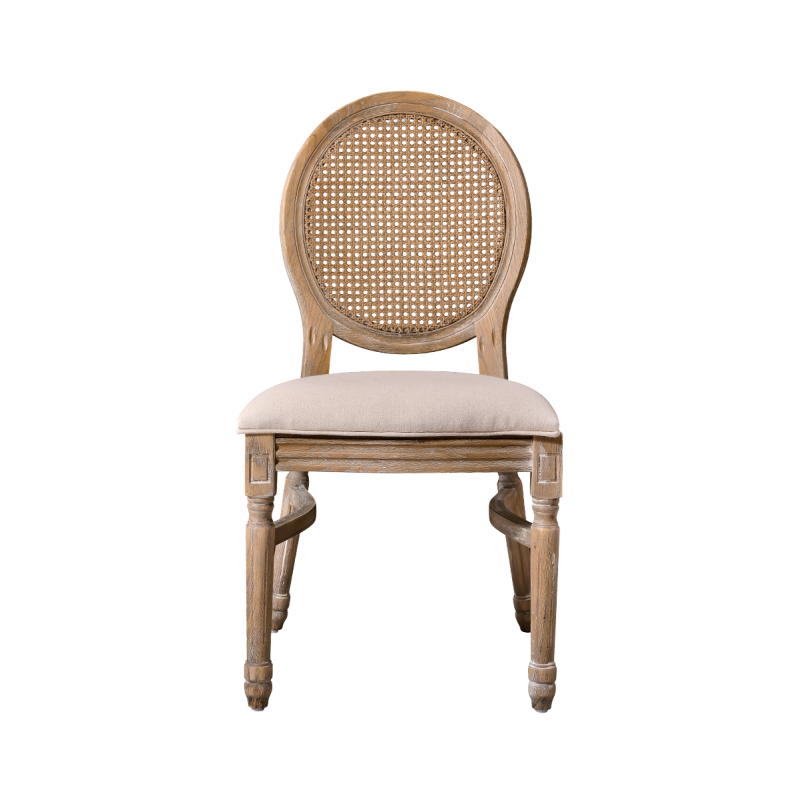 Realizzata in legno massello, la sedia garantisce la stabilità e la durata necessarie all’uso intensivo negli spazi commerciali. Lo schienale in rattan spezza con discrezione la forma classica, aggiungendole leggerezza e raffinatezza. La seduta imbottita assicura comfort anche durante cerimonie e ricevimenti prolungati.